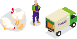 At Megalo, we provide the required inputs of DOC (Day Old Chicks), Feeds at a fixed rate. Also, we buy-back the same grown-up saleable birds at a fixed rate throughout the agreement period.